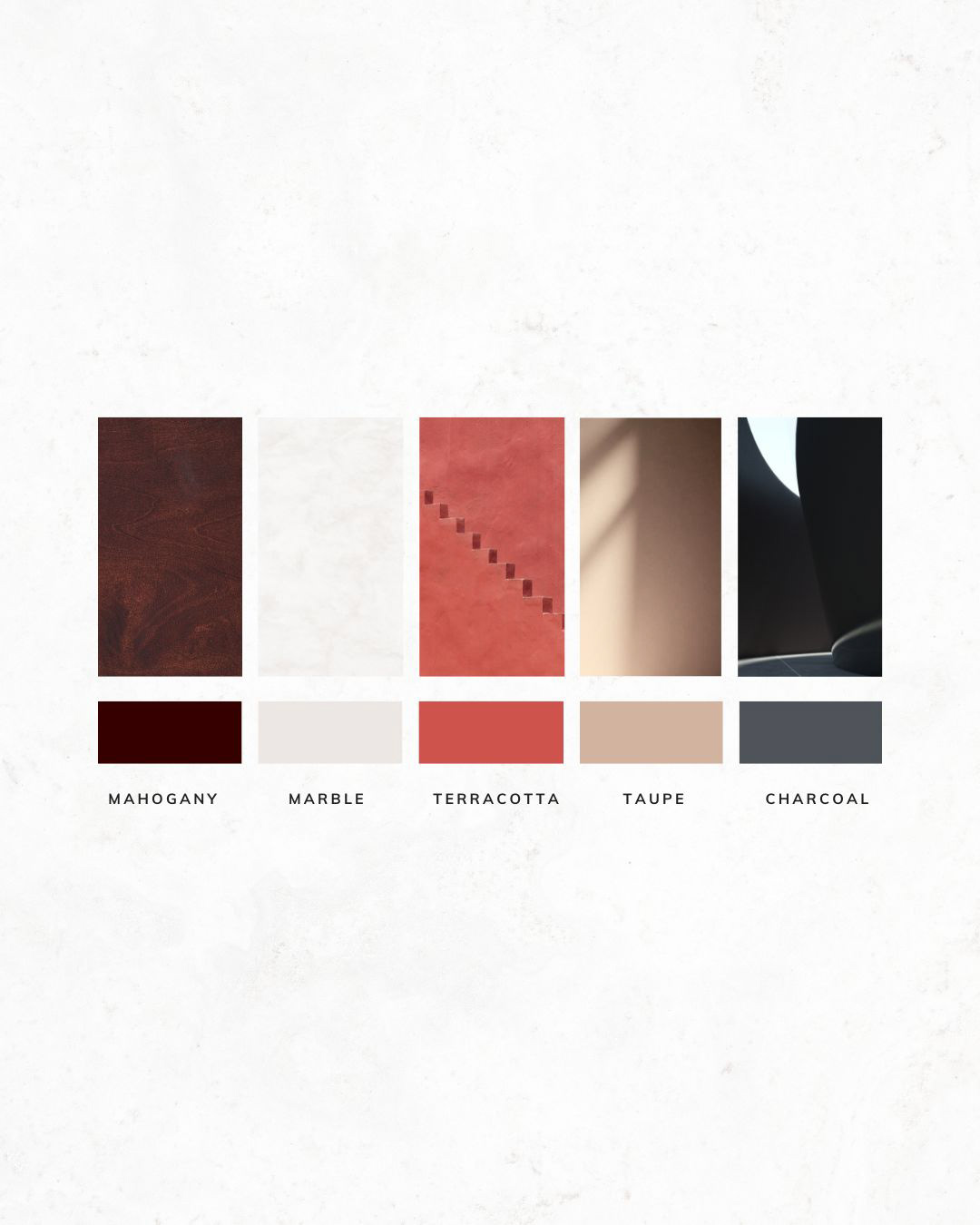 La palette associe des tons minéraux profonds, des nuances chaleureuses et des neutres lumineux, structurés par une touche plus froide. Ce contraste traduit la double dimension de la marque : humaine et accessible, tout en étant rigoureuse et parfaitement cadrée.